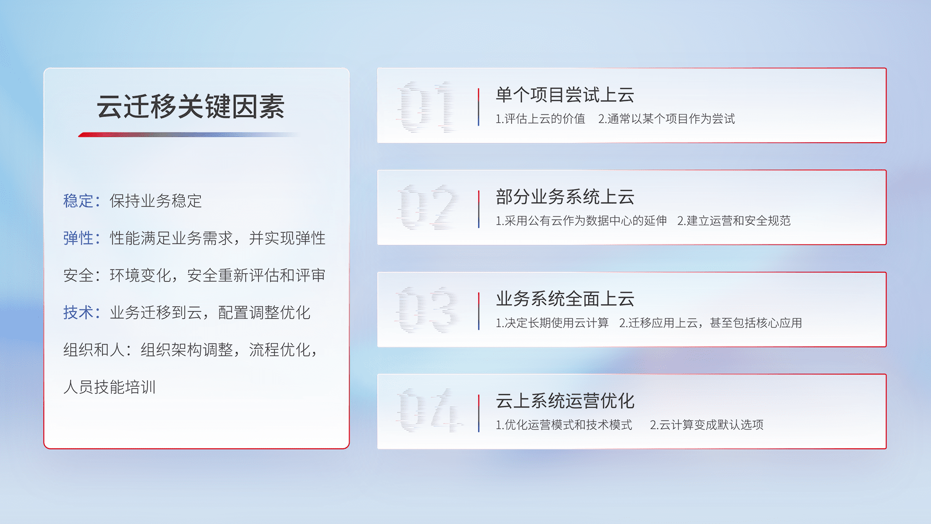 结合实际业务,,,从规划设计、、、、云平台选型、、、云原生改造、、、、数据迁移、、、集成交付,,,,迁移全过程为客户识别最佳上云路径,,做好风险识别管理,,设计网络架构、、身份权限、、、、安全审计合规、、操作审计、、、日志审计、、、、监控告警策略、、、、多站点容灾设计等,,,对云上基础设施进行整体规划,,,,提升IT治理水平,,以满足弹性、、、、高可用、、、高性能的需求。。。。