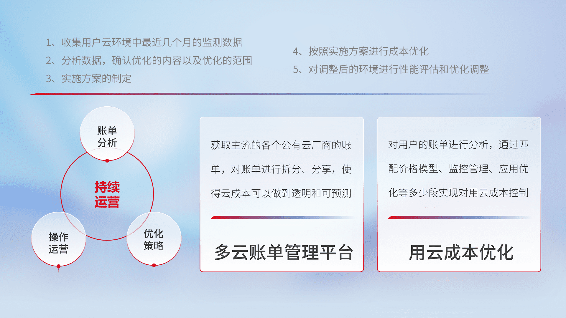 通过多云纳管,,以统一的资源数据模型把客户的云资源进行抽象和封装,,,进而实现对多云资源的统一操作,,保障云资源管理的可靠性、、、、稳定性与可用性。。量身定制化运维内容,,,配置、、、开发运维、、、、补丁管理、、、备份、、、监控、、、、认证和访问管理、、、审计和日常巡检等,,,,保障在用云过程中的可靠度,,,稳定度以及高可用率。。。。